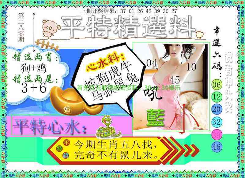 281期【解一句真言】:华夏大地羊马来,大地,解地肖蛇羊虎鼠狗鸡 王牌看好生肖:蛇羊虎鼠狗鸡 王牌看好10码:13.37.11.23.04.28.18.30.32.21 王牌看好波色:蓝波+绿波 王牌看好单双:单数+马虎 |