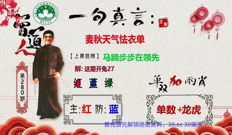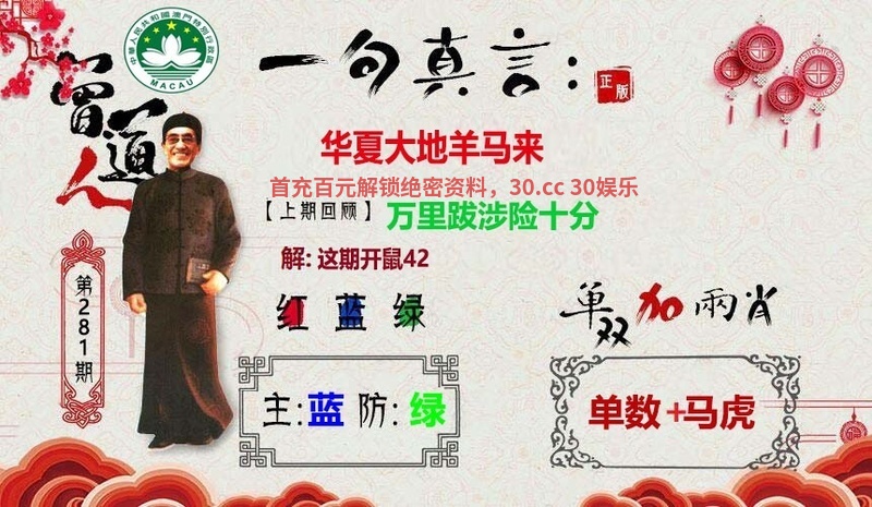 279期【解一句真言】:马蹄步步在领先,领先,解武将生肖蛇牛狗猴马虎 王牌看好波色:绿波+蓝波 王牌看好单双:单数+狗虎 |